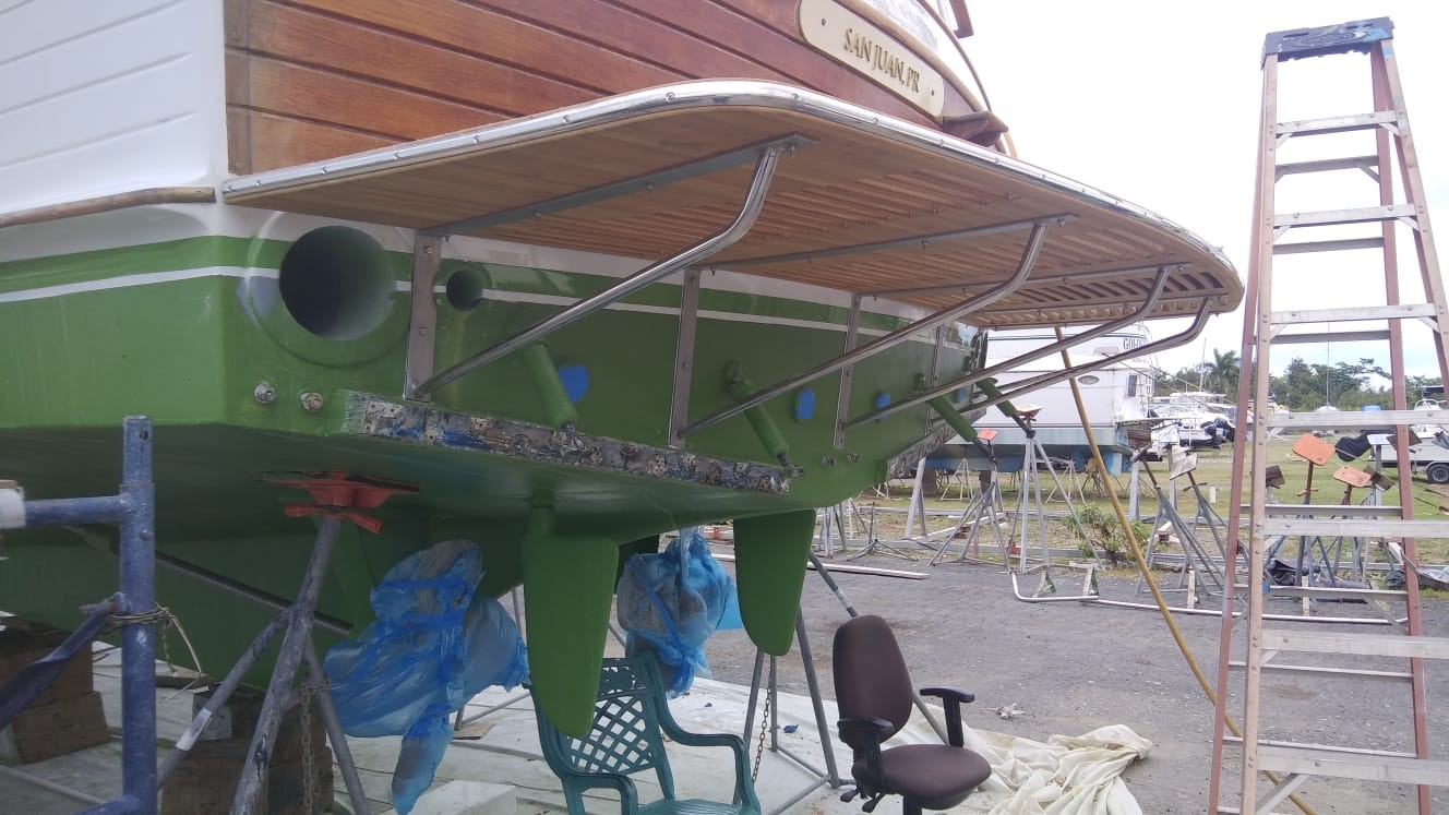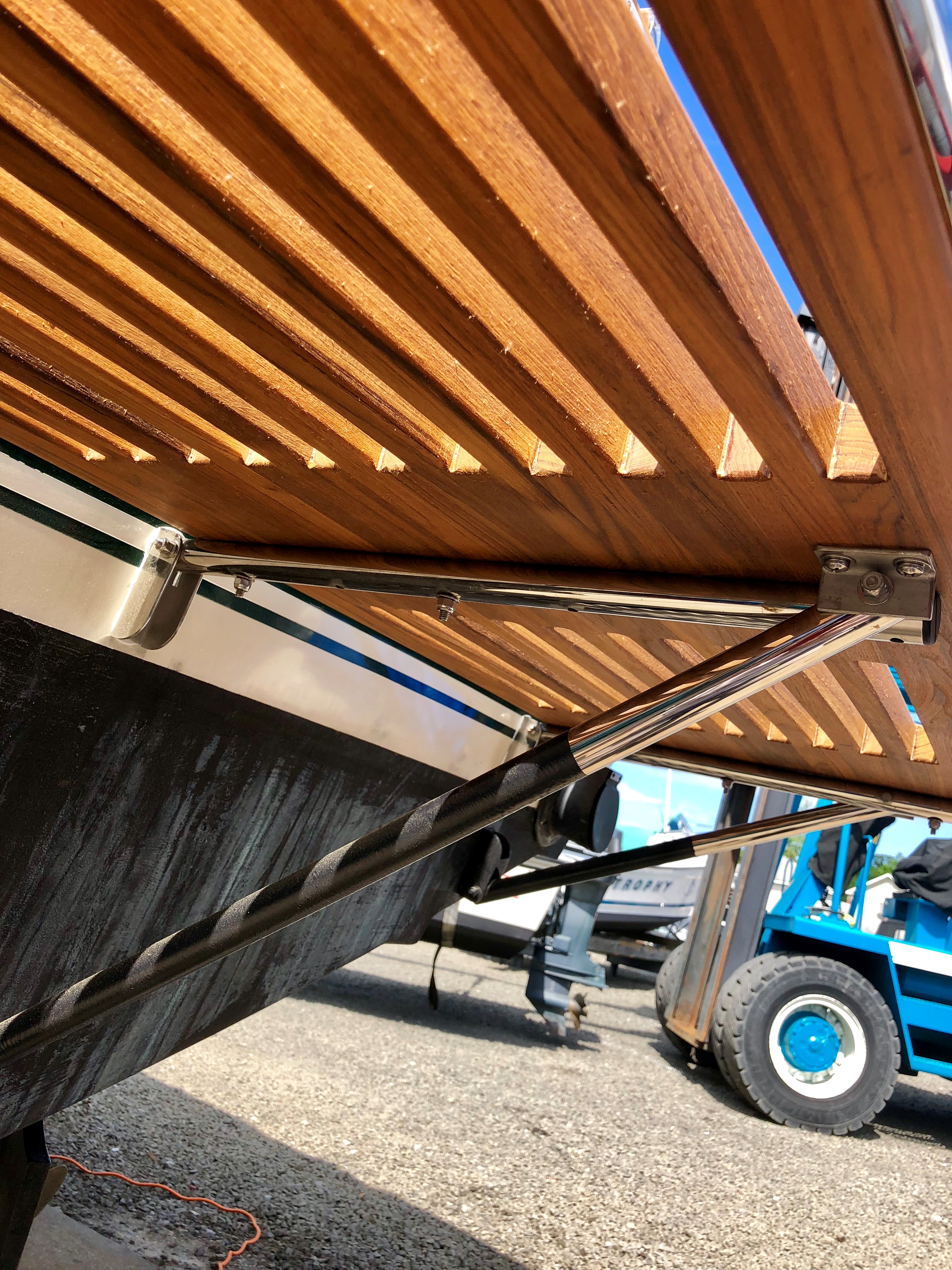 Our standard platform support brackets are constructed of 1″, 16 gauge, polished 316 stainless steel tubing. The tubing is bolted to heavy-duty (11 gauge) 316 stainless steel fittings, which are bolted to the transom. The supports and platform can be removed for storage or for working on the transom, without disturbing the through-bolted fittings. Our deluxe support brackets are constructed of 316 stainless steel and are not removable. They are custom made to fit your boat and platform. All mounting hardware is included with our support brackets.