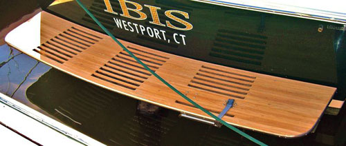 Close-up of a boat named IBIS from Westport, CT with wooden deck details.